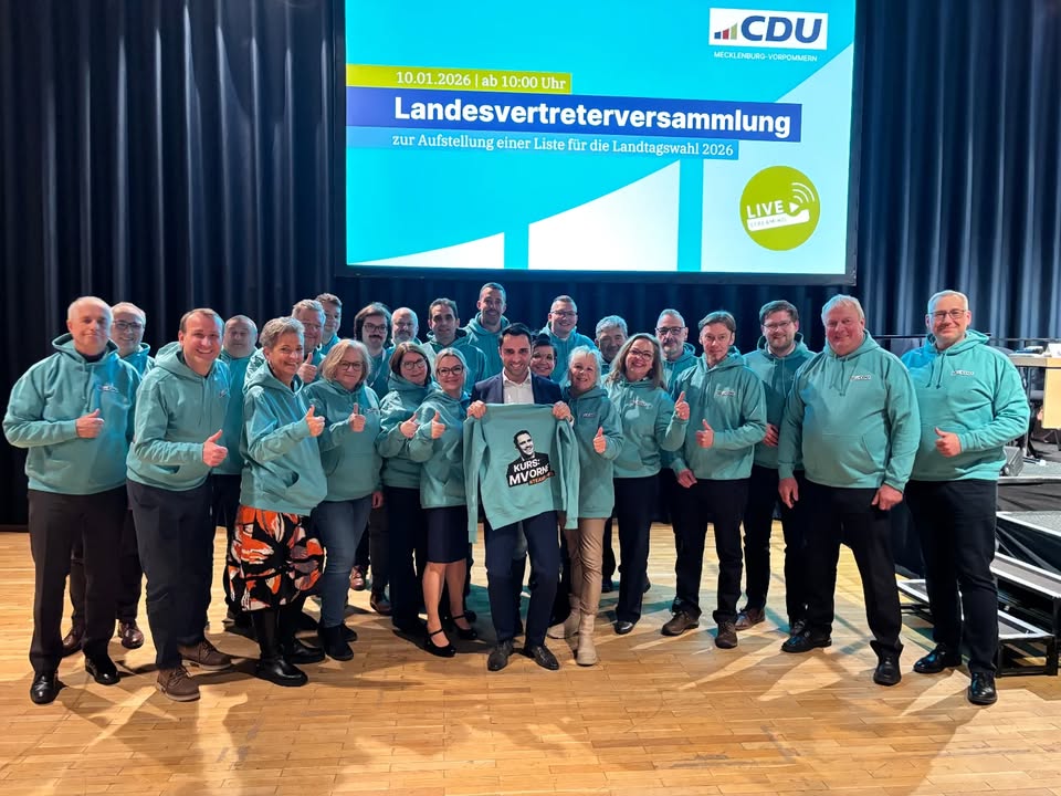 Rostock, 10. Januar – Die CDU Mecklenburg-Vorpommern hat heute auf ihrer Landesvertreterversammlung in Rostock die Weichen für die Landtagswahl 2026 gestellt. Mit großer Geschlossenheit wurde die Landesliste beschlossen und das neue 9-Punkte-Programm „MVorne – verbindlich für den Politikwechsel“ präsentiert.